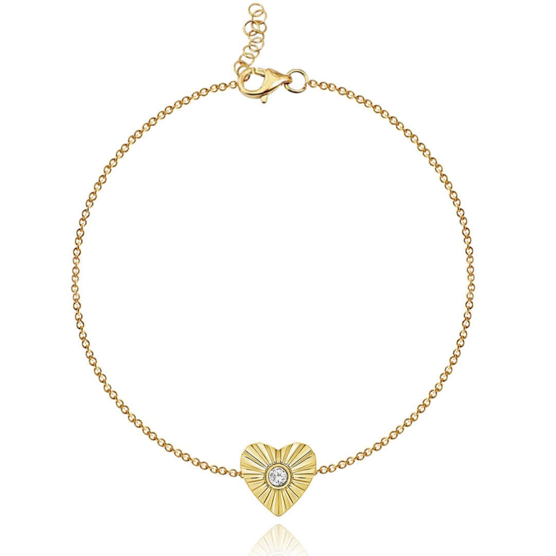 This 14k gold bracelet features a beautifully textured heart and a sparkling white diamond at its center. Elevate your style and express your love with this exclusive piece.